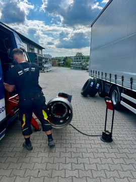 Działamy nieprzerwanie od 2015 roku, a nasz zespół posiada certyfikaty TruckForce i Akademia GoodYear. Pracujemy na wyważarkach klasy premium i kompresorach o wydajności 500 l/min, dlatego większość napraw zamykamy w 30 minut. Ponad 300 opinii w Google ze średnią 4,9 potwierdza, że wyjazd kończy się zawsze bezpiecznym powrotem na trasę.